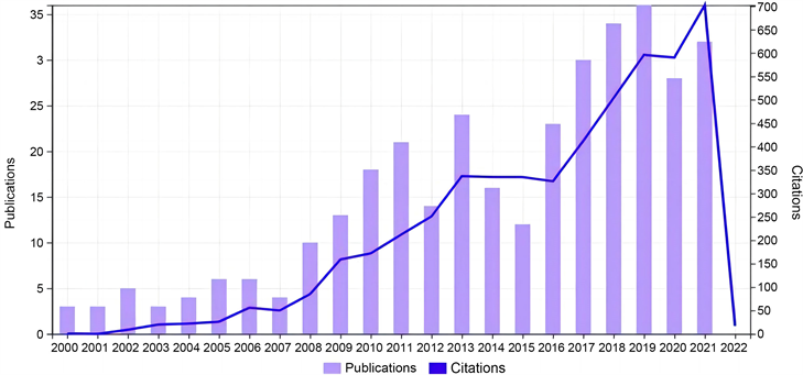 From 2000 to 2021, although there were some fluctuations in the number of publications on acupuncture and moxibustion treatment of infertility in the Web of Science, the overall number showed an increasing trend (Figure 1). It is predicted that publication output will continue to expand in the future.