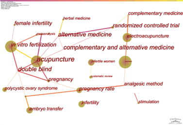 Using CiteSpace to generate institutional maps, 335 nodes and 347 links were generated. 958 publications were distributed among 335 research institutions. Heilongjiang University Chinese Med published the largest number of articles, the number of citations was 372 and the centrality was 0.06, indicating that the institution has made significant contribution to the research of acupuncture and moxibustion treatment of infertility. Wu, X.K from Heilongjiang University Chinese Med is an important scholar in acupuncture research. RCT on acupuncture in the treatment of infertility was published in JAMA Internal Medicine with an IF: 56.272. It is worth noting that in this article, Wu, X.K et al. found that in Chinese women with PCOS, acupuncture combined with or without clomiphene did not increase the live birth rate compared with acupuncture and placebo [24] . Interestingly, another article published by this scholar on the treatment of oligoasthenozoospermia with acupuncture pointed out that acupuncture can significantly increase the serum level of testosterone (T), reduce the concentration of follicle stimulating hormone (FSH), LH and estradiol (E2), and increase the pregnancy rate [45] . Beijing University of Traditional Chinese Medicine has published 13 articles with 267 citations and 0.05 centrality, indicating that it also plays an important role in this field. In addition, superimposed visualization shows that Huangzhong University of Science & Technology, Korea Oriental Medical College, Western Sydney University and Xuzhou Medical University have made significant contributions in this field in recent years.