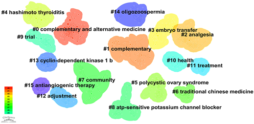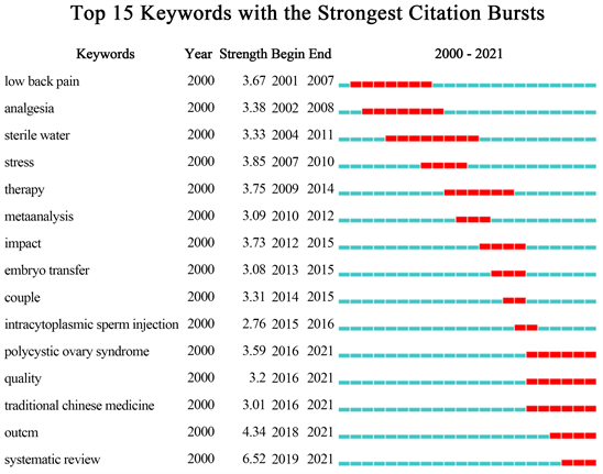 Acupuncture is the keyword with the highest co-occurrence frequency, which appeared in 2002, with a citation intensity of 1.58, indicating that acupuncture has received extensive attention in the treatment of infertility from 2000 to 2021. In the previously published articles, some studies have shown that acupuncture is a valuable treatment, which exerts a significant effect on improving clinical pregnancy rate and alleviating anxiety [13] [27] . In contrast, alternative studies believe that the efficacy of acupuncture in the treatment of infertility lacks of supporting evidence [46] [47] , indicating that the efficacy of acupuncture in the treatment of infertility is not accurate and needs further research. In addition, in vitro fertilization also has high centrality and frequency, and the adjuvant effect of acupuncture in in vitro fertilization has been widely concerned. Some literature has shown that acupuncture can reduce the pressure of embryo transfer, improve endometrial thickness and improve patient satisfaction [13] [48] . The keyword cluster analysis suggests that “in vitro fertilization” is the largest cluster, with 66 members, and the most active reference in this cluster is “Acupuncture in improving endometrial receptivity: a systematic review and meta-analysis [49] ” published by Zhong Y, et al. In 2019, among the first 15 clusters, five are complementary and alternative medicine represented by Chinese traditional medicine (“Chinese herbal medicine” “acupuncture” “electroacupuncture” “moxa treatment”), indicating that complementary and alternative medicine is receiving increasing attention in the treatment of infertility. Combined with cluster analysis and outbreak keyword analysis, it can be found that infertility with PCOS and traditional Chinese medicine including acupuncture is one of the research directions for the treatment of infertility.