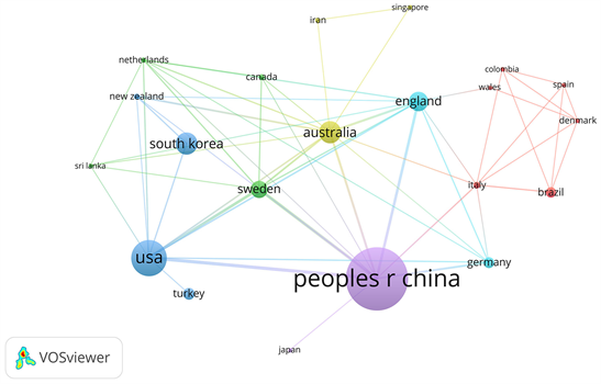 VOSviewer (Version 1.6.14) is employed to analyze the co-occurrence knowledge graph of citation networks of countries, institutions, periodicals and documents [21] [22] . A node represents an element, such as countries, institutions, authors, journals, references and keywords. To ensure unity, the top 50 objects are selected for each element. The greater the link width between nodes is, the closer the cooperation relationship is, and the size of nodes indicates the number of elements represented. The node with high centrality represents the turning point or pivot point related to this field, which is represented by purple.