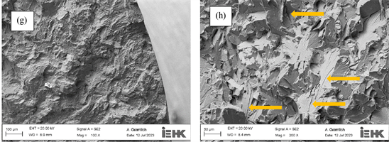 The fracture surfaces of the fractured tensile specimen are demonstrated in the above figure at a condition of 0.01 mA/cm2 under a slow strain rate test. The fracture surface was observed through Scanning Electron Microstructure (SEM) with different magnifications to thoroughly observe the nature of the crack from initiation to propagation in all orientations. Figures 7(a)-(d), Figure 7(g), Figure 7(i)-(k) highlight the effect of hydrogen embrittlement on the work piece; a mixture of brittle fracture mode with intragranular cleavage and shear fracture with large separations can be observed. The microvoid coalescen (MVC) could be seen in Figure 7(i), which demonstrated that as the material undergoes tensile deformation, microvoids can form and grow. These microvoids may coalesce and contribute to the overall fracture process. A mixture of intragranular cleavage and shear fracture with large separations can be observed. Label inside the position of brittle. A change in fracture micromechanics is also observed for the hydrogen in-situ charging sample at 0.01 mA/cm2. However, as shown in Figure 7(h), the fracture surfaces of the martensitic samples are characterized by a mixture of two mechanisms: intergranular fracture and decohesion [19] . The intergranular fracture normally occurs when the slip systems intersect prior austenite grain boundaries [23] . Decohesion always depends on local hydrogen concentration and stress in the interface with dislocation slip and therefore hydrogen transport. The yellow arrows indicate secondary cracking is observed along the austenite grain boundaries of the fracture surface. It is also attributed to a