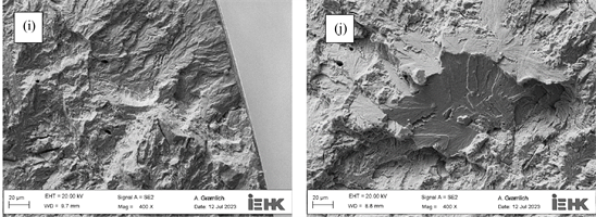 Figure 8 showed LOM images around the main crack. The main crack on Figure 8(e) and Figure 8(g) was initiated at the corners of the side edges of the specimen and propagated to the other side of the specimen. The direction of the macroscopic crack propagation was approximately perpendicular to the tensile axis as shown in Figure 8(f). Additionally, we followed the main crack path in our microstructure analysis in order to understand its propagation mechanism. The micro-cracks were also observed to investigate further crack initiation sites and to better understand the fine details of the crack propagation.