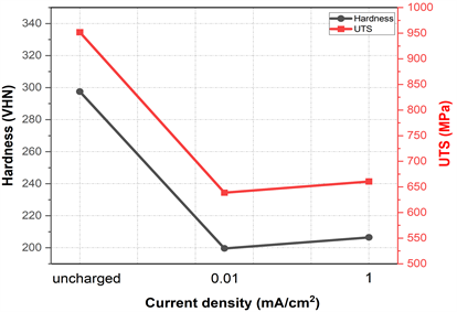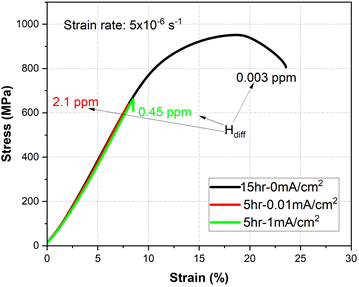 The loss of mechanical properties was computed from the reference uncharged slow strain rate test data, which served as the baseline for our analysis. As compared to the two other parameters, which were charged at current densities of 0.01 mA/cm2 and 1 mA/cm2, respectively. Such losses were established by the given expression below [18] .