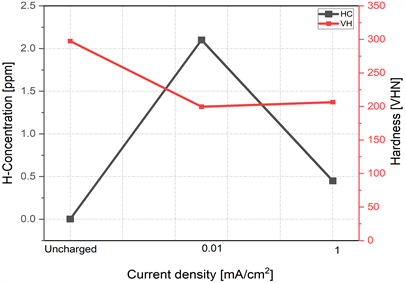 Figure 10. Comparative plot of hydrogen concentration, Vickers hardness, and current density.