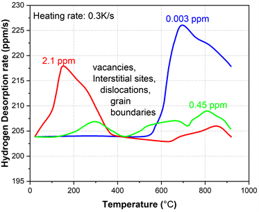 Figure 4 illustrates the hydrogen desorption curves at the constant heating rate of 0.3 K/s starting at RT to maximum temperature of 900˚C. The first peak at each curve highlighted with a low temperature is associated with hydrogen desorption from lattice defects where the hydrogen trapping energy is relatively low. These defects include vacancies, interstitial sites, dislocations, and twin and grain boundaries [21] . The second-highest temperature peak in the red legend is associated with high hydrogen concentration, such as segregation interfaces and