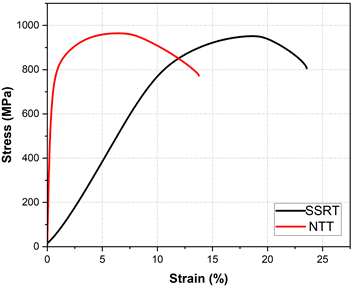 Figure 5. Engineering stress-strain curves of 42CrMo4 steel from SSRT and NTT.