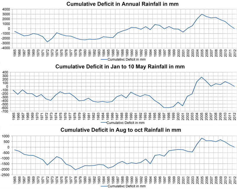 Figure 8. (a) Long term rainfall trends (b) Annual rainfall (c) Rainfall deficit hydrograph.