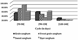 In general, the cycle of cultivars varied from 70 to 140 days and this variation varied according to the type of sorghum and the agroclimatic area. All the accessions collected can be structured into three groups based on the length of the maturity cycle (Figure 5). The first group characterized early accessions with a cycle of less than 90 days and represented 41.20% of grain sorghum cultivars, 64.9% of sweet grain sorghum, 85.7% of sweet sorghum and 50% of dyer sorghum. The second group consisted of cultivars with a medium cycle between 90 and 120 days and represented 47.10% of grain sorghum, 32.40% of sweet grain sorghum, 14.30% of sweet stem sorghum and 50% of dyer sorghum. The third group characterized the latest-cycle cultivars (≥140 days) and consisted of 11.80% of grain sorghum and 2.70% of sweet grain sorghum.