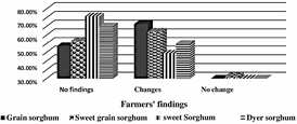 The results of the survey showed that most of the farmers (55.7%) noticed changes in their types of sorghum over the years. On the other hand, 44.3% of the farmers did not notice any variation in their types of sorghum. These changes included transition from one type of sorghum to another (12.37%), reduction in potential yield (8.25%), changes in the taste of grains and stem (15.46%) and changes in grain colour (19.59%) within the same type.