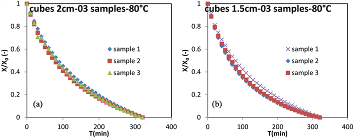 For Figure 2(a) The results show that the differences between the curves X/X0 (kge/kgms)/(kge/kgms) are minimal, going close to zero (0) for the most repetitive to 0.357 − 0.332 = 0.025 obtained, as the most unfavorable case, for samples 1 and 2 of the cubic samples of 1.5 cm edges at the 120th minutes of drying.