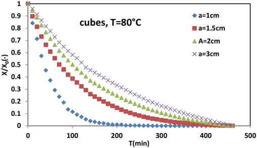 Indeed, for the same cubic shape, several dimensions were used. Specifically, the cubic samples of edges 1, 1.5 cm, 2 cm and 3 cm were used for convective drying at 80˚C.