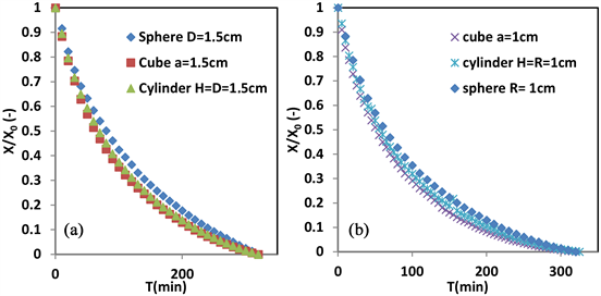 Figure 3 contains the results from the convective drying of these different samples. The average of the normalized water contents X/X0 (−) of the four dimensions of the same geometric shape, namely the cube.