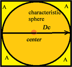 Figure 1. Concept of the characteristic dimension Dc: largest sphere cut from a specimen of any shape. The center (C) of the characteristic sphere contains the humidity furthest from the exchange surface. The parts limiting transfers (A) constitute a brake on transfers in the characteristic sphere. Thus, the points at the border of the characteristic sphere are not directly exposed to drying, Ouoba, 2013 for the cube or cylinder shape.