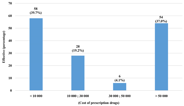 The median cost of prescription drugs was 12,500 FCFA with extremes ranging from 6,000 to FCFA 590,310 FCFA (Figure 1).
