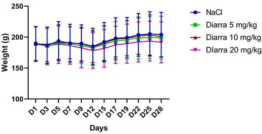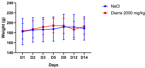 “Diarra” administered once daily at doses of 5, 10 and 20 mg/kg for 28 days did not cause any lethality, behavioural disorders or significant weight loss in rats (Figure 3).