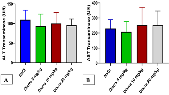 Figure 6. Transaminase activity of rats after 28 days of exposure to “Diarra” in a single daily administration.