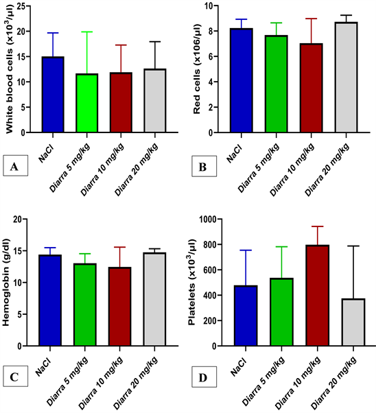 Figure 7 shows the effect of “Diarra” on white blood cell count (A), red blood cell count (B), haemoglobin (C) and platelet count (D). No significant change was observed in these parameters (p > 0.05). The other haematological parameters (haematocrit, mean corpuscular volume, mean corpuscular haemoglobin content, lymphocytes monocyte, polynuclear neutrophils, polynuclear eosinophils, polynuclear basophils) did not show any significant change as well (p > 0.05).