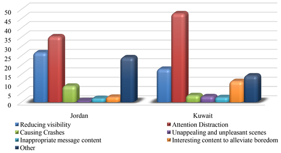 Moreover, Kuwait stands out with a significantly higher percentage (11.2%) of respondents finding roadside advertisements interesting enough to alleviate boredom, whereas Jordan’s figure is notably lower at 2.7%. This disparity suggests a stark contrast in the effectiveness of ads in engaging the audience for these purposes. Interestingly, the “Other” category in both countries is substantial, accounting for 24% in Jordan and 14.2% in Kuwait. These diverse responses highlight concerns and distractions not covered by specific categories, underlining the need for a nuanced approach to addressing various issues related to roadside advertisements. The data reveals significant disparities in distractions faced by drivers in Jordan and Kuwait, and the difference in responses between groups is statistically significant (χ2 = 25.2, p = 0.00).