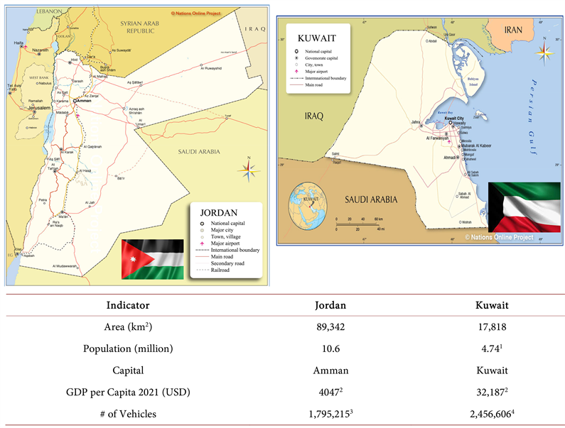The study areas are Jordan and Kuwait, two Middle Eastern countries (Figure 2). The two countries have differences in area, population, vehicle ownership, and economic status. Kuwait’s population density (253 people per km2) is