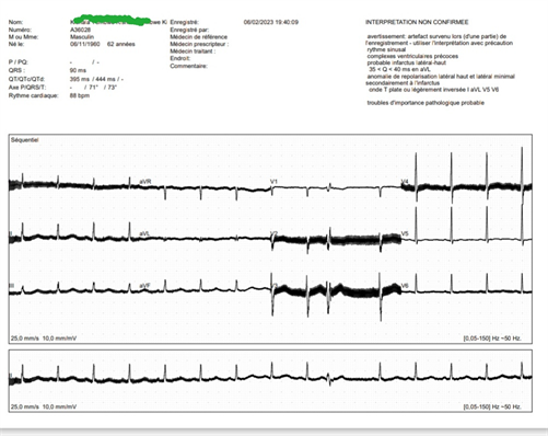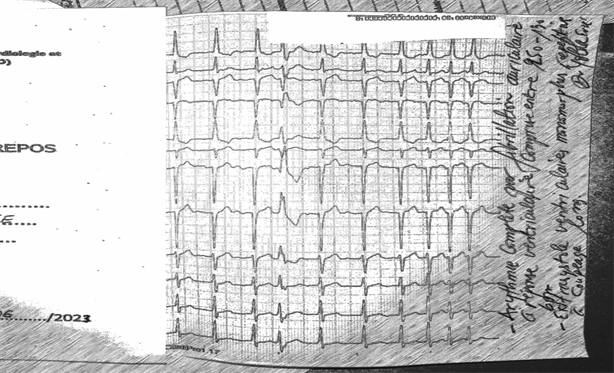 The electrocardiogram found arrhythmia due to atrial fibrillation and monomorphic ventricular extra systoles (see Figure 3).