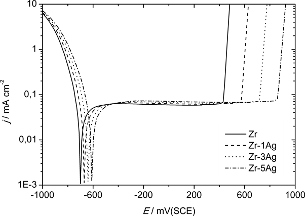 behaviour of specimens in the aggressive environment pointed out from the EOC measurements. Both cp Zr and Zr-Ag alloys exhibit a passive potential range, ascribed to the formation and growth of a stable and protective oxide film, followed by a sharp increase in current density indicating breakdown of passivity and rapid growth of pitting.