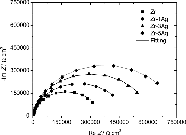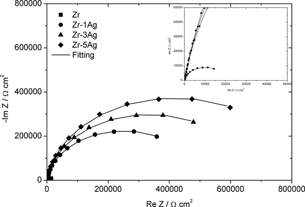 Figure 3 reports the EIS spectra, in the form of Nyquist diagrams, of cp Zr and Zr-Ag alloys at open circuit potential, after 2 h exposure to aerated artificial