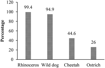 Almost all the inhabitants around the park perceive more the disappearance of the rhinoceros (99.40%) and the wild dog (94.90%), while few people are informed of the disappearance of the cheetah (44.60%) and ostrich (26.00%) in the park (Figure 6). Only the oldest of the interviewees attest to having had the privilege of seeing the rhinoceros, the cheetah and the ostrich. According to them, the rhinoceros and the cheetah would have disappeared about forty years ago and the wild dog, about ten years. Only two old men interviewed aged 95 and 99 were able to estimate the disappearance of the ostrich in the localities of