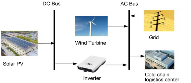 Extensive research has been conducted on renewable energy systems comprising solar photovoltaic and wind energy. Ahmad, M et al. investigated and compared the technical and economic feasibility of grid-tied photovoltaic power generation in the small and medium-sized enterprise sector of Pakistan’s manufacturing industry in 2022 [9] . Gao Haiyang proposed energy-saving methods for various facets of cold chain logistics and summarised energy conservation technologies in the cold storage industry [10] . Nkalo et al. conducted technical and economic analysis of a solar wind power generation system to meet the electricity needs of rural communities in Nigeria [11] . Zhang proposed the optimal configuration of a hybrid renewable energy system equipped with photovoltaic and wind turbines systems to fulfil the electricity needs of a workshop in Adabir, Iran [12] . Rehman et al. studied the feasibility of grid-tied photovoltaic systems. They identified the best location for installing a photovoltaic power generation system. Imam, Amir A. et al. conducted a technical and economic feasibility assessment of a grid-tied photovoltaic energy conversion system of a residential building in Jeddahin, Saudi Arabia. The results revealed that the capacity coefficient and performance ratio were 22% and 78%, respectively [13] [14] . The potential of China’s cold chain logistics demand is enormous, cold chain logistics consume large amounts of energy. The cost of cold chain logistics accounts for approximately 70% of the total cost, which is more than twice that of developed countries [15] . Therefore, the power supply structure should be transformed and the generation of renewable energy increased. China has great potential for renewable energy development, and solar photovoltaic is one of the most widely used energy in China.