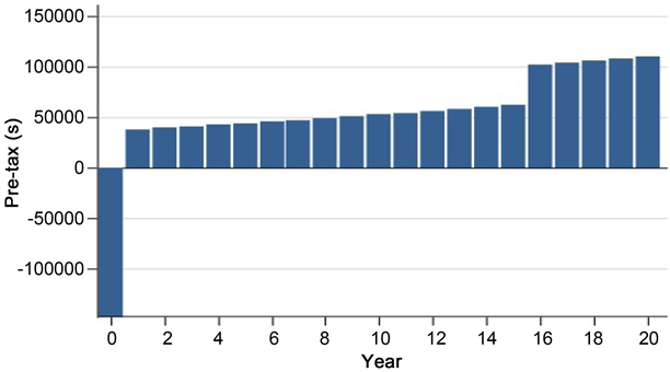 Mehmood et al. described the economic feasibility of a project as a measure of its NPV, IRR, annual lifecycle savings, and payback period, all of which are important determining factors for the financial feasibility of the project [32] . RET-Screen software calculates annual living savings and other financial indicators. The output of financial parameters is shown in Figure 5, which presents the annual cash flow of the proposed hybrid system. Considering the payback period, the cash flow of the hybrid system was positive, indicating a positive income.
