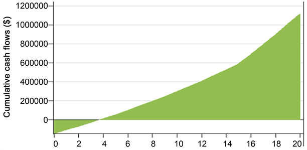 Figure 6 shows the cumulative cash flow of the hybrid system. The equity recovery period of this project was the 11th month of the 3rd year. These findings have attracted renewable energy investors. Figure 7 shows the time required to recover the investment in years, and it may be the most widely used financial indicator in investment. Noticeably, the ALCS value of this project is high. Figure 7 also shows the financial feasibility of the proposed system.