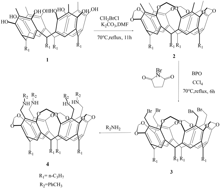 The synthesis of compounds 1, 2 and 3 was synthesized according to the literature [22] method, and tetramethylene toluidine cavitand 4 was prepared by treating compound 3 with excess amines (Scheme 1).