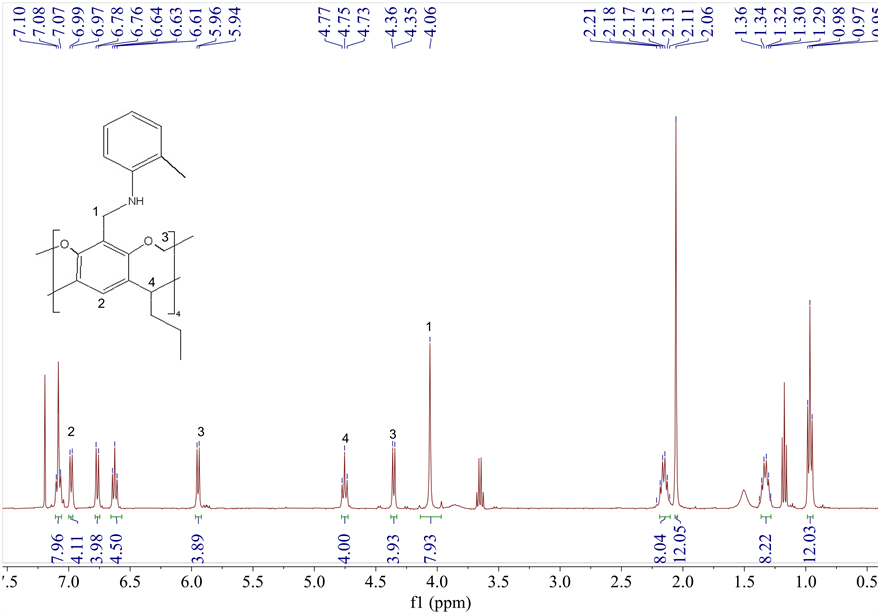 Methods in the synthesis of tetramethylene toluidine cavitands [19] [27] , Bromo-treated tetramethylene toluidine cavitands were prone to occur nucleophilic substitution reaction, and the synthesis method was relatively simple and the reaction speed was relatively fast. In this reaction, tetramethylene bromide cavitand can be dissolved in primary amine, no additional solvent was required, dissolved with dichloromethane, washed with deionized water, dried and removed solvent to obtain tetramethylenetoluidine cavitand. The cavitand 4 has a polyhydrophobic group, and the single crystal of compound 4-EtOH was volatilized by using dichloromethane and ethanol mixed solvent as the crystallization system. FT-IR spectrum of complex 4 showed the existence of both contractive vibration peak of N-H in the range of 3318 - 3438 cm−1 and a strong absorption peak of C-N at around 1164 cm−1 as shown in Figure 1. In the 1H NMR spectrum of complex 4 as shown in Figure 2, the chemical shift of ArH protons exhibited as a singlet at 7.13 ppm, indicating of the C4v isomer. The bridging Ar2CHCH2 protons exhibited as a triplet at around 4.80 ppm. The chemical shift of ArH on methylaniline exhibited as multiple peaks between 6.67 - 7.18 ppm. The bridging Ar2CH2NH protons exhibited as a singlet at approximately 4.10 ppm.