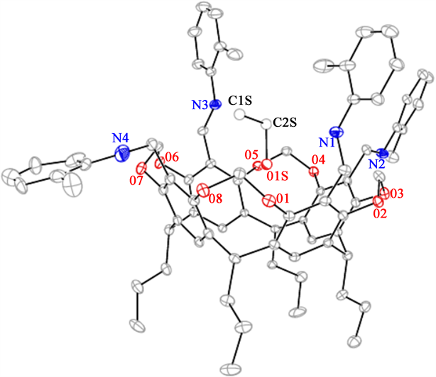 Four o-tolubenzenes were connected to resorcicalix[4]arene by nitrogen atoms, and two phenolic hydroxyl groups were connected with methylene groups, which makes the amine-modified methyl cavitand have different properties than resorcicalix[4]arene. From the crystal structure of compound 4-EtOH, it can be seen that the upper edge C-2 position was connected to the hydrophobic aromatic group, the hydrophilic phenolic hydroxyl group at the upper edge were bridged by methylene, the lower edge was a hydrophobic hydrocarbon group, thereby changing the properties of resorcicalix[4]arene. The methylene bridged o-toluidine