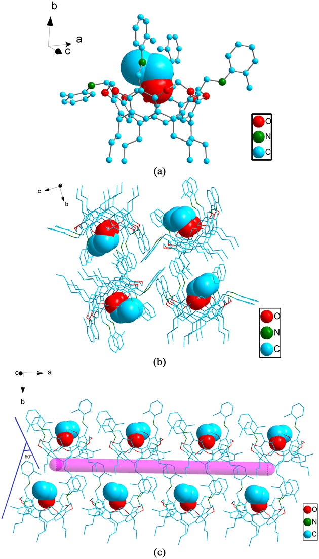 resorcicalix[4]arene units between the one-dimensional chain were not parallel in Figure 4(c), there was an angle of about 60˚, the crystal arrangement adopts this dislocation arrangement because the upper edge of the resorcicalix[4]arene has an aromatic group, the lower edge has a chain hydrocarbon group, and the dislocation arrangement ensures the crystallographic stability of the structure.