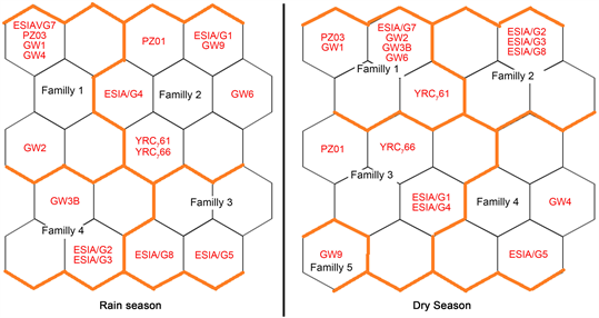 Figure 3 presents the samples according to physicochemical parameters distribution during the two main seasons (rainy and dry) in each grouping it defined by the hierarchical classification analysis used. Drillings belonging to the same family have the same physicochemical parameters contents.