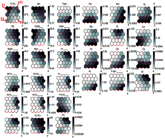 The physicochemical parameters of the boreholes were processed using the Kohonen self-organizing map (S.O.M). Based on the quantification (QE) and topography (TE) errors (Table 4), a Kohonen map of 20 cells (5 rows × 4 columns) is chosen to project the 17 samples.