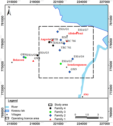 Family 1 waters are also the most widespread in the study area (Figure 8). The waters of family 2 are found more in the center of the study area. The waters of family 3 are less distributed and are found in the center and east of the study area. The drillings of family 4 are grouped together in the center of the Angovia mine operating permit zone. Finally, water from family 5 is found further south of the study area.