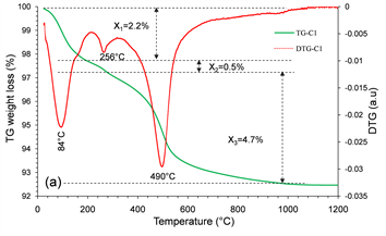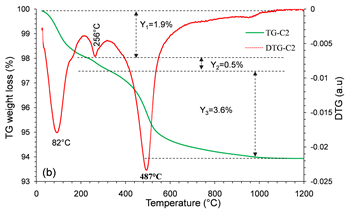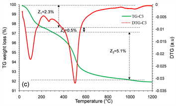 The three curves in Figure 8 highlight the mass losses as a function of the peaks observed on Figure 4. From the TGA curve on Figure 8, the mass loss of 1.33, 1.18 and 1.29% was observed for C1, C2 and C3 respectively. The second endothermicpeaks between 453 and 550˚C (C1), between 450 and 530˚C (C2) and between 486 and 546˚C (C3) following the mass losses 6.1, 4.22 and 5.86% respectively are due to hydroxylation kaolinite and their transformation into