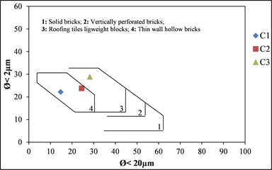 The mineralogical compositions, physicochemical properties and thermal behavior of the studied CMs were almost similar. The ratio of SiO2/Al2O3 is range between 4.0 to 5.4 and the cumulative percentage of 6.5% < CaO + MgO + K2O + Na2O < 8.2% are very important to elaborate a ceramic product with these raw clay materials. The evaluation of the suitability of the studied raw materials base on empirical diagram of Winkler (1954) (see Figure 10) indicated that, the three clay samples are suitable of grains fractions for roofing tiles lightweight bricks and thin-walled.