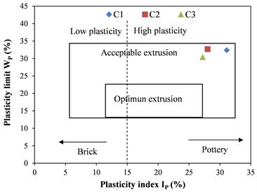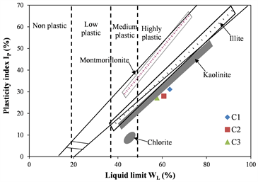 28.0% and 27.2% respectively C1, C2 and C3 samples. The data from Table 1 were used to plot the Holtz and Kovacs diagrams presented in Figure 3, which indicate that, that sample CMs samples C1, C2 and C3 exhibits a kaolinitic character and are highly plastic.