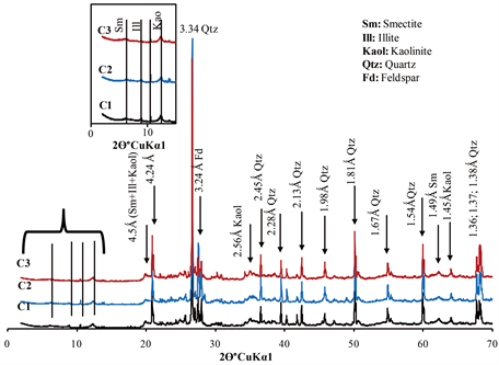 The exothermic peaks of thermograms observed around 561˚C, 545˚C and 557˚C respectively for the three samples C1 C2 C3, illustrate the hydroxylation of illite and smectite (Figure 7). The quartz content of the three samples could not be compared due to the overlapping peaks similarity from different minerals. Quartz is identified here by its progressive disintegration in the temperature range of 927 to 948˚C, with a shift in its content around 1100˚C; although the
