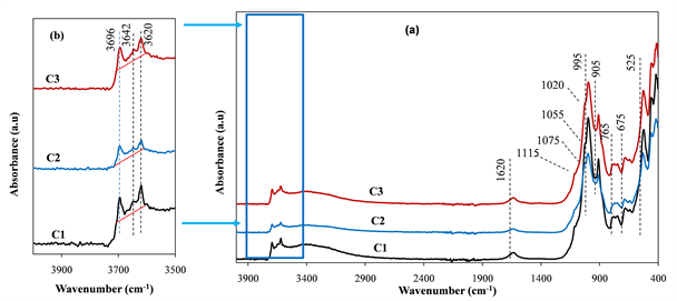 Figure 6. (a) Complete FTIR Spectra of Clay soils from Kaliwa (C1), Kabé (C2), Malo (C3), (b) OH stretching domain.
