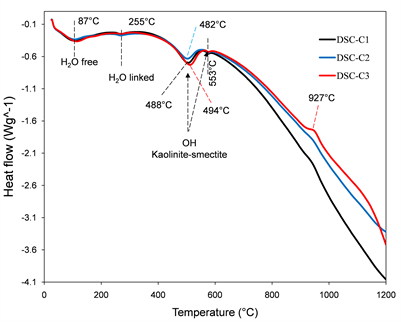 Thermogravimetric and differential analyzes (TGA/DSC) for all samples were carried out and the resulting curves are presented on Figure 7 and Figure 8. Figure 7 presents the heat flow variation with temperatures for the three samples. From the Figure 7 two prominent endothermic peaks located between the temperature of 0 to 260˚C and 400 to 600˚C as well as another barely perceptible exothermic peak in between 900 and 1000˚C were observed for the overall samples. The observed picks can be assigned to the water loss, the decomposition of hydroxides and organic matter and finally the quartz transformation and the loss into carbonates. The first peak at 87˚C corresponds to the water hygroscopic departure from the illite sheets [36] [37] [38] . The second endothermic picks at ~ 482, 488, 494 and 553˚C for sample C1, C2 and C3 respectively followed by mass losses are due to hydroxylation (OH) of kaolinite (transformation into metakaolinite and smectite.