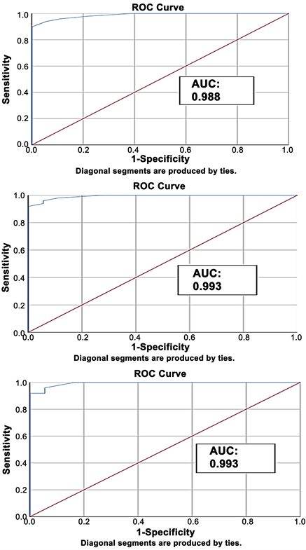 The receiver operating characteristic (ROC) curve processed for the 1 hr postoperative period iPTH assay presented 93.9% sensitivity and 94.4% specificity for a cut of value of ≤14.0 pg/mL and mean AUC (area under the ROC curve) 0.988. It was statistically significant. The ROC curve processed for the 4 hr postoperative period iPTH assay presented 95.9% sensitivity and 94.4% specificity for a cut of value of ≤09.5 pg/mL and mean AUC 0.993. It was statistically significant. The ROC curve processed for the 24 hr postoperative period iPTH assay presented 91.8% sensitivity and 94.4% specificity for a cut-off value of ≤11.0 pg/mL and mean AUC 0.993. It was statistically significant (Figure 2).