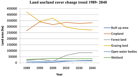 Generally, cropland and grazing land accounted for the highest percentage of land use/land cover across the entire period. Built-up area increased from 1989 to 2040, forest land also increased across this period save for the year 2009. On the contrary grazing land declined from 1989 to 2040 also registering an increase only in 2009. Cropland on the other hand registered cyclic episodes from one decade to another across the entire period, wetland and open water bodies registered a narrow range of change in land cover variations across the entire period unlike other land use/cover classes (Figure 6). The observed variations in LULC