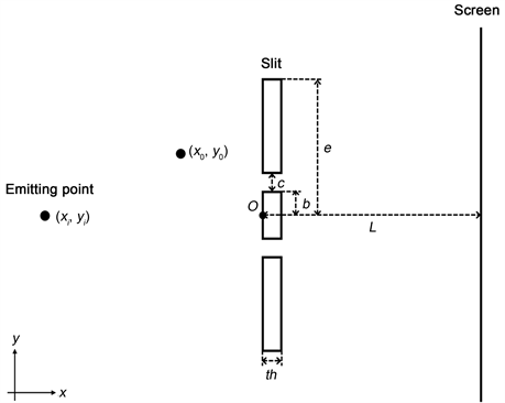 Figure 1. x-axis shows the emitted direction of a particle. At x = 0, a slit wall is placed perpendicular to the x-axis, showing the y-axis. The slit spacing, width, and wall length are “2b”, “c”, and “2e”, respectively. The thickness of the slit wall is “th”. The distance dependent part of the potential exerted by the slit system with the particle position (x0, y0) is U(x0, y0).