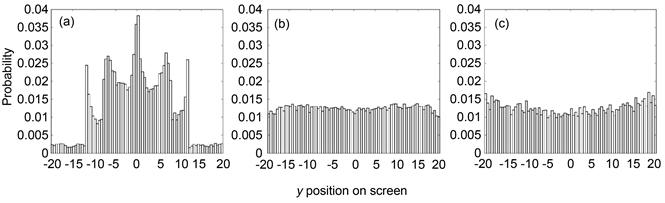 emission position of −12, screen position of 125 or 50, slit wall length of 2000, and emission number of particles of 20,000,000 or sometimes 2,000,000. Distribution of the arrived particles on screen was calculated from 80 samples obtained with bin 0.5. The particle velocity was kept 1 as previous.
