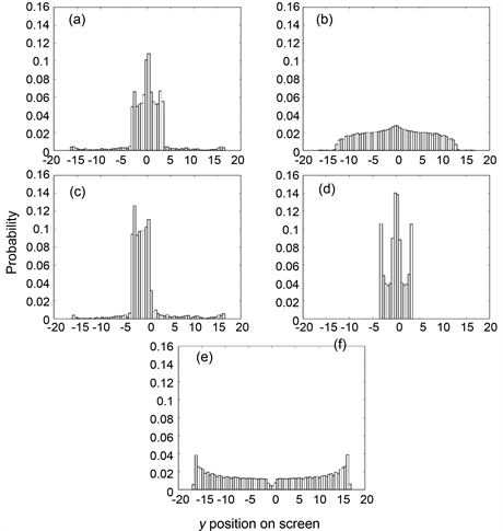 Figure 2. Comparison of the simulated interference patterns using zero slit thickness with the corresponding theoretically calculated patterns. For each condition, two panels are shown. Left panels (a), (c), and (e) show the simulated patterns and right panels (b), (d), and (f) show the theoretical patterns, which are calculated according to the optics text [11] as described at the legend for Figure 2(e) in the previous report [3] . (a) Slit width 0.1 (c), slit spacing 0.6 (2b), length of the slit wall 2000 (2e), initial velocity 1 (vxi) in x direction, time step 0.3 (dt), emission position xi = −12 (−40 × dt), interaction strength 0.14498 (ratio), screen position 100 (L), number of emitted particles 2,000,000. On screen, 80 samples were counted with the sampling bin width 0.5. The number of the arrived particles at each position on the screen divided by the total number arrived (18,442) was plotted as the probability. (b) The theoretically calculated pattern of the double slit interference based on the light wave description with the wavelength 0.15. The y position was calculated via 𝑦 = 15tan𝜃. Other conditions are the same as described for the panel (a). Relative intensity was plotted. (c) Slit width 1, slit spacing 6, time step 3, emission position −120, interaction strength 1.385, screen position 220, bin width 2, and total number of particles arrived 53,810, respectively. (d) The theoretically calculated pattern with the wavelength 1. (e) Slit width 0.04, slit spacing 0.06, time step 0.04, interaction strength 0.0208, particle emission position −4, screen position 24, bin width 0.1, and total number of particles arrived at the screen 556,605. (f) The theoretically calculated pattern with the wavelength 0.03.