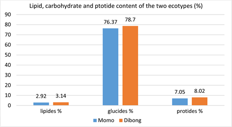 The biochemical composition of the two fonio ecotypes (dibong and momo) is presented in Table 1 supported by the illustration of Figure 1.