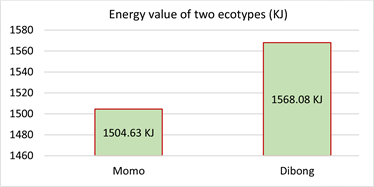 contents of the two ecotypes were virtually identical. In addition, the values of 1504.63 kJ for momo and 1568 kJ for dibong were practically the same. There was no significant difference in energy content p > 0.05 following the Figure 2 and Figure 3.